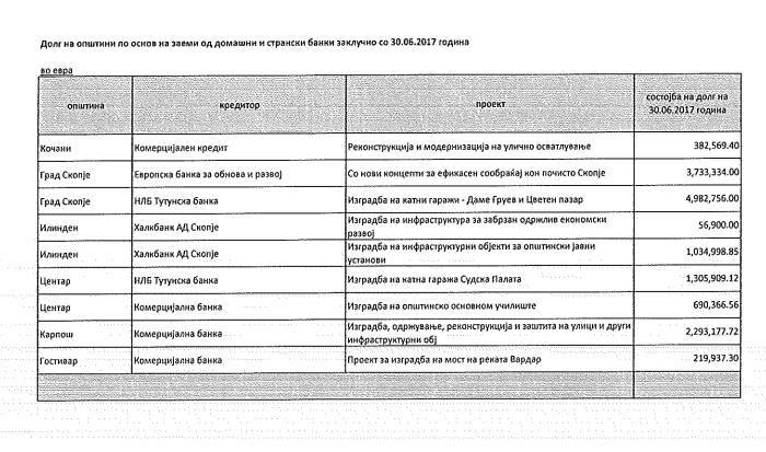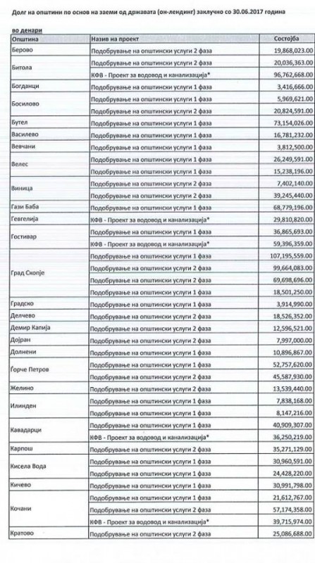 На барање на „Макфакс“ за пристап до информации од јавен карактер Министерството за финансии испрати список на сите општини кои имаат задолжување кај домашни и странски деловни банки, како и состојба на долг на јавните претпријатија по основа на задолжување кај државата (он-лендинг), заклучно со 30.06.2017 година.