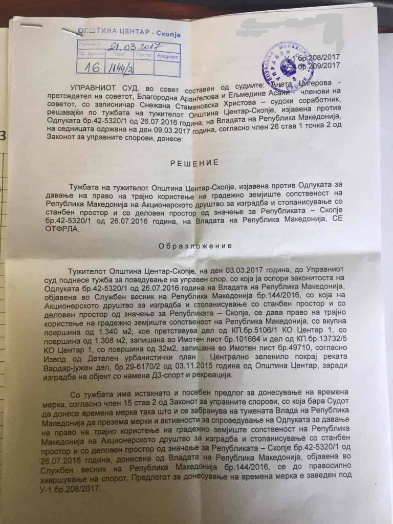 Но, Жерновски не само што го поништил одобрението за градба, туку соочен со фактот дека Владата постапила незаконски кога имотот го давала на АДСДП покренал тужба против одлуката со која земјиштето се дава на трајно користење на претпријатието за станбен и деловен простор. Управниот суд, верувале или не, носи пресуда во која наведува дека не станува збор за управна работа без разлика што одлуката е акт на влада.