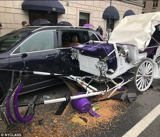 Коњот зајуришал по должината на Шестата авенија, при што кочијата удрила два автомобила. Потоа кочијашот успеал да го заузда исплашеното животно.