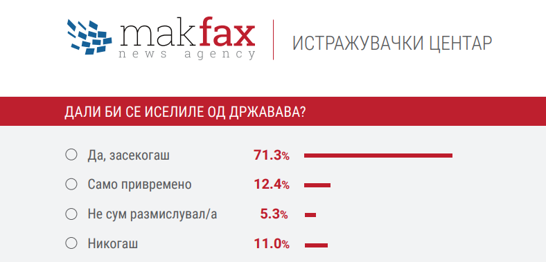 Истражувачкиот центар на „Макфакс“ спроведе анкета со прашање „Дали би се иселиле од државата“ во траење од 24 часа, односно во периодот од 9 април до 10 април напладне, а спроведена на 15 веб-страници.
