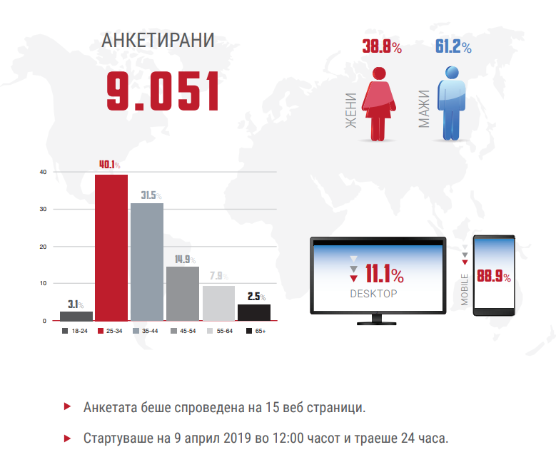 Повеќето од учесниците во анкетата се на возраст од 25 до 34 години, односно дури 40 проценти. Од 35 до 44 години се втората најголема група што учествувала во анкетата, односно 31,5 отсто.