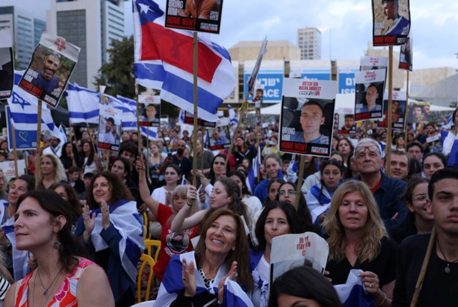 Илјадници луѓе се собраа околу голем екран на Плоштадот на заложниците, мавтајќи со израелски знамиња и држејќи знаци на кои пишуваше „тие се враќаат дома“.
