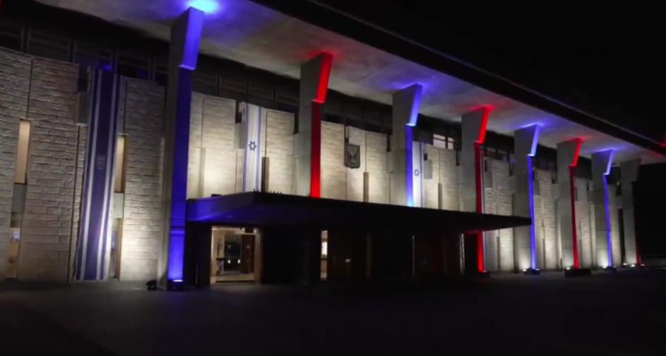 Зградата на израелскиот парламент, Кнесетот, е осветлена во црвена, бела и сина боја во чест на очекуваната посета на американскиот претседател Доналд Трамп.