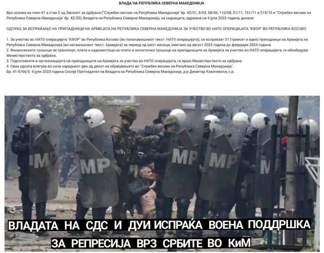 „Владата на СДС и ДУИ мината недела донесе одлука за испраќање 31 припадник на македонската армија да учествуваат во ‘операцијата КФОР на КиМ, во период од 6 месеци’! Со ваквата одлука марионетската Влада го продолжува директното учество во репресиите врз српскиот народ на Косово и Метохија, репресија што се спроведува во корелација и под палката на нашите „стратешките партнери“.