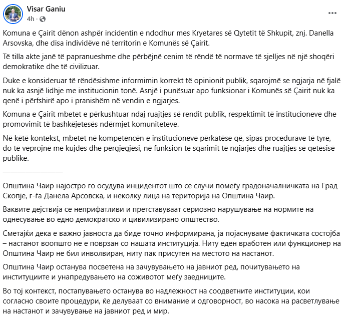 „Општина Чаир најостро го осудува инцидентот што се случи помеѓу градоначалничката на Град Скопје, г-ѓа Данела Арсовска, и неколку лица на територија на Општина Чаир.