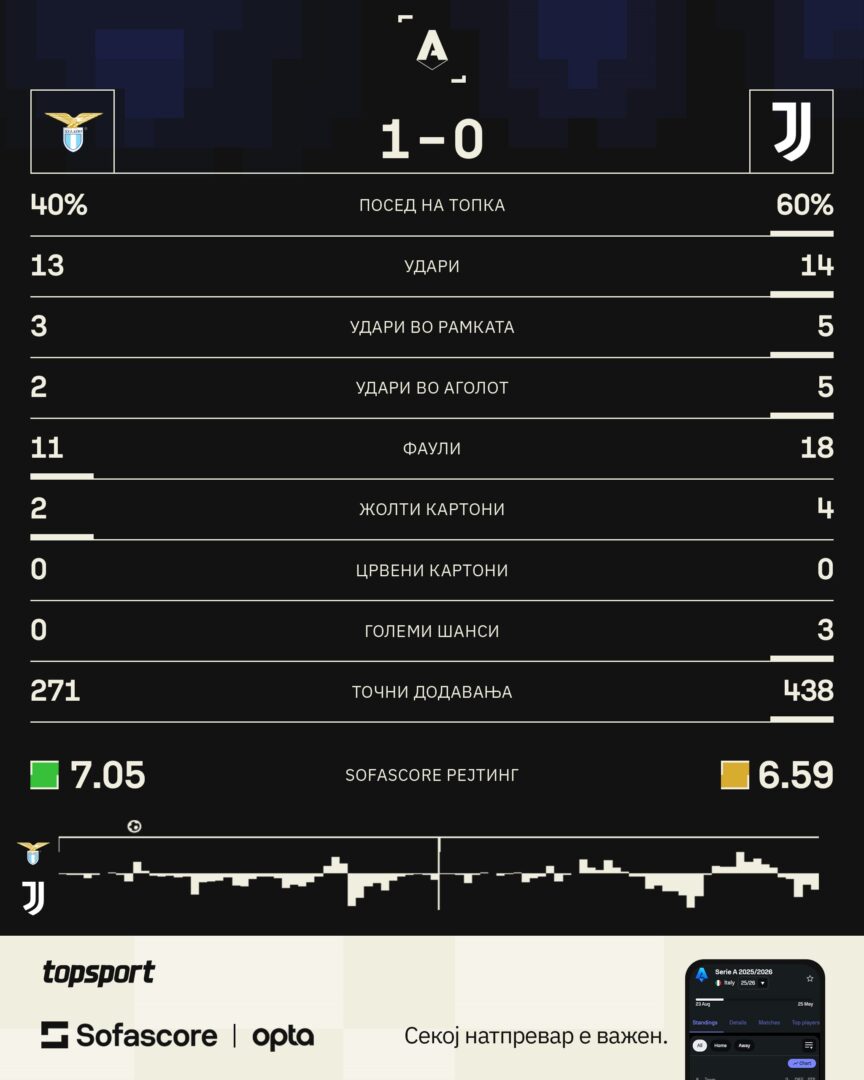 Фудбалерите на Лацио го победија Јувентус со 1:0 во последниот натпревар од деветтото коло на италијанската Серија А. Единствениот гол на натпреварот го постигна хрватскиот фудбалер Тома Башиќ, кој беше стрелец во деветтата минута од натпреварот. Тоа беше неговиот прв гол по 907 дена.