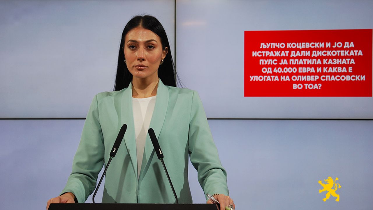 Љупчо Коцевски и јавното обвинителство да истражат дали газдата на дискотеката „Пулс“ ја платил казната од 40.000 евра за која неговиот син во телефонска кореспонденција вели дека Оливер Спасовски како министер на МВР ќе ургира да не ја платат, бара Викторија Андоновска од ВМРО-ДПМНЕ.