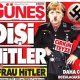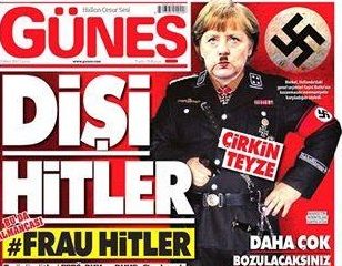 На насловната страница на турскиот провладин весник „Gunes„ се најде Ангела Меркел, прикажана со мустаци и нацистичка униформа. Епитетот “Женски Хитлер”, остро се нагласува...