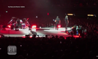 Пејачот на бендот „Металика“, Џејмс Хетфилд, падна на сцена во Холандија но, како што вели, освен егото, ништо друго не повредил. Снимката направена од еден посетител...