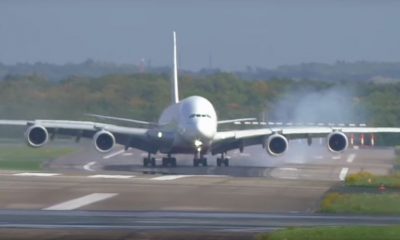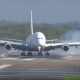 Најголемиот патнички авион во светот „ербас А380“ на компанијата „Емирејтс“ со 500 седишта е снимен како во текот на силно невреме се бори да слета на...