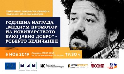 Самостојниот синдикат на новинари и медиумски работници вечерва ќе ја додели Годишната награда „Медиум промотор на новинарството како јавно добро – Роберто Беличанец“ за 2019 година....