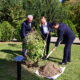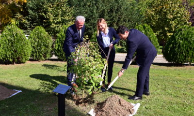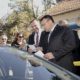 Министерката за финансии Нина Ангеловска, генералниот секретар на Светската царинска организација Кунио Микурија и директорот на Царинската управа Ѓоко Танасоски, во дворот на Царинската управа денеска...