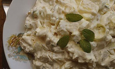 Потребно е: 3 средни компири – испечени и изладени 1 среден страк праз 1 китка свеж власец 2-3 помали гранчиња свеж целер 3 тврдо варени јајца 100 гр мајонез 250 мл кисела павлака...