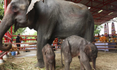 Будистичките монаси во Тајланд денеска благословија слон близнаци, машки и женски, една недела по нивното тешко раѓање. Нивната мајка, слонот Чамчури, роди близнаци на 7 јуни...