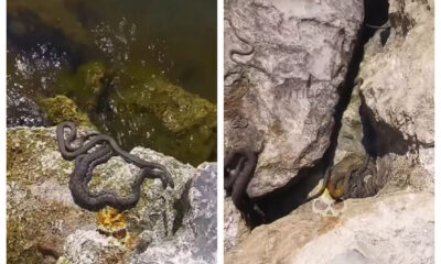 На социјалните мрежи стана вирална снимка од куп змии како лежат на карпеста плажа во Драч, а потоа брзо ползат назад во водата кога снимателот им...