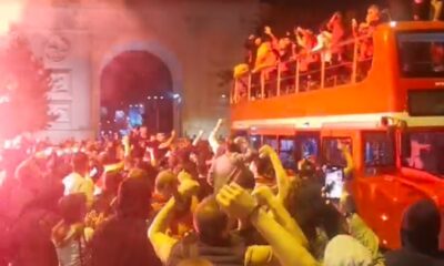 Со овации, пароли, навивање беа дочекани фудбалерите на Вардар, откако клубот се врати во Првата лига. Тие на шампионски начин беа поздравени од фановите собрани близу...