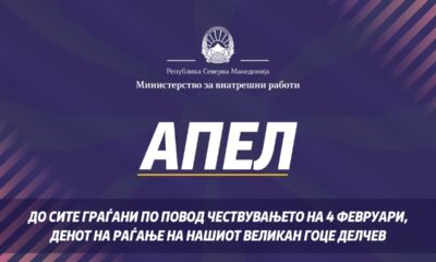 Министерот за внатрешни работи, Оливер Спасовски, упатува апел до граѓаните по повод чествувањето на 4 февруари, денот на раѓањето на нашиот великан Гоце Делчев: Упатувам апел...