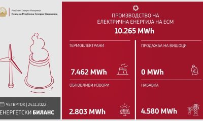 АД ЕСМ на 24.11.2022 година произведе 10.265 MWh електрична енергија. Во Термоелектраните произведени се 7.462 MWh, а во хидроелектраните и во Ветерниот парк Богданци произведени се...