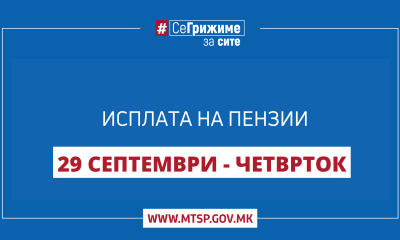 Министерството за труд и социјална политика известува дека на 29.9.2022 година (четврток) почнува етапната исплата на пензиите за септември, кои продолжуваат да се исплатуваат предвремено. Подигнувањето...