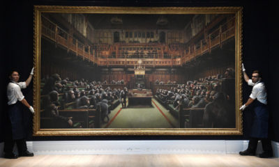 Контроверзната слика од уличниот артист Банкси, на која е прикажан британскиот Парламент исполнет со шимпанза наместо пратеници, беше продадена на аукција за неверојатни 9,9 милиони фунти....