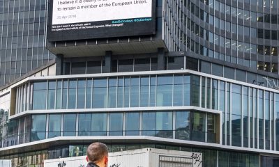 Непосредно пред значајниот состанок на ЕУ во Брисел, џиновски билборд во центарот на градот ја изложи антибрегзитската изјава што Меј ја даде во 2016 година, направена...