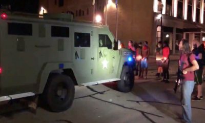 Група тешко вооружени демонстранти во Кеноша биле снимени при нападот со солзавец за време на напнатиот судир со полициските службеници во оклопен полициски камион во Кеноша,...