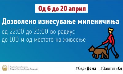 За време на полицискиот час сопствениците на миленичиња може да ги изнесат во периодот од 22 до 23 часот. „За време на забраната и посебниот режим...
