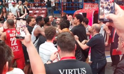 Српскиот кошаркар Милош Теодосиќ се степа со навивачи по натпреварот меѓу Милано и Виртус Болоња (79:76) од финалната серија од плеј-офот во Италија. Тој не успеа...