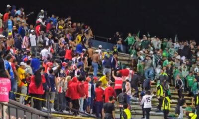 Големото дерби од 10. коло на колумбискиот шампионат меѓу Атлетико Национал и Атлетико Јуниор е прекинато во 55. минута од натпреварот по целосен хаос на трибините...