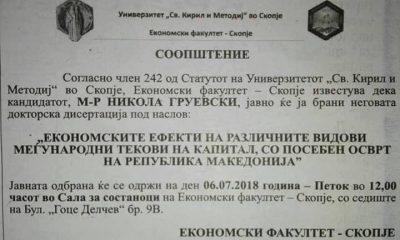 Експремиерот Никола Груевски следниот петок, на 6 јули, на Економскиот факултет во Скопје ќе ја брани докторската дисертација. Темата на докторатот е „Економските ефекти на различните видови...