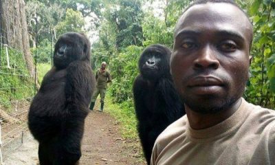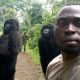 Две горили се фотографирани како позираат на опуштено селфи со ренџери, кои ги спасиле како бебиња. Фотографијата е направена во сиропиталиште во Националниот парк Вирунга, во...