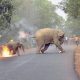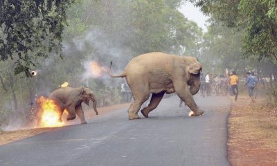 Фотографија од запалено бебе слон и неговата мајка како бегаат од толпа што ги нападнала фрлајќи камења и крекери на нив победи на меѓународниот натпревар за...