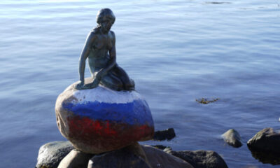Непознат сторител нацртал руско знаме на камен на кој стои статуа посветена на бајката на Ханс Кристијан Андерсен во пристаништето во Копенхаген. Данската полиција објави дека...