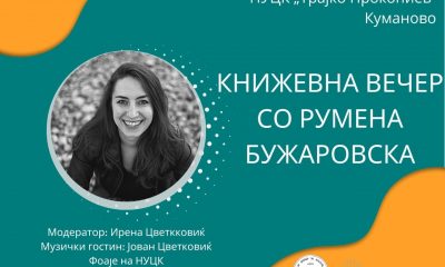 Вечерва со почеток во 20 часот во фоајето на Националната установа Центар за култура „Трајко Прокопиев“ Куманово ќе се одржи настанот „Книжевна вечер со Румена Бужаровска“....
