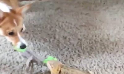 Корисник на „Твитер“ објави видео од куче како си игра со гуштер. На видеото се гледаат гуштер и куче како се натегаат за зелено-сива плишена играчка...
