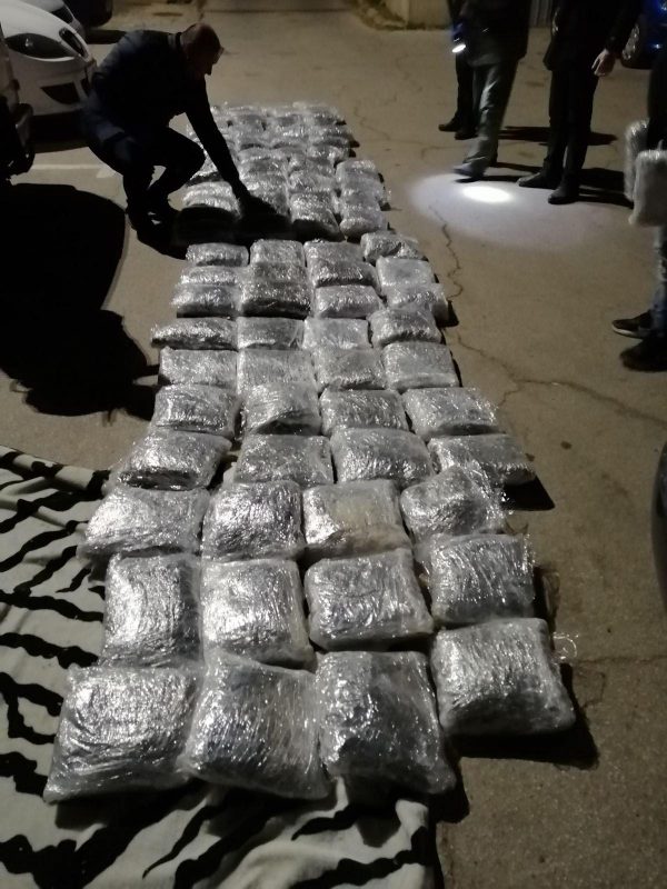 При извршен преглед на возилото биле пронајдени вкупно 92 полиетиленски пакувања со марихуана, некои спакувани во патни торби, а други во багажниот простор во делот за резервната гума и на задните седишта, а кај приведените лица се пронајдени и повеќе мобилни телефони, СИМ-картички од мобилни оператори од Косово и РС Македонија и пари, кои се предадени на вештачење.