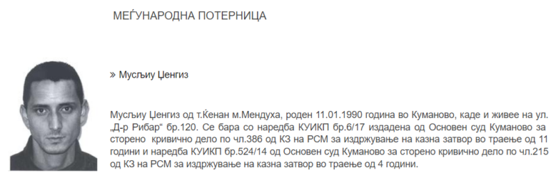 Во прегледот на барани лица со меѓународна потерница на македонското Министерство за внатрешни работи стои дека Џенгиз Мусљиу е роден 11.1.1990 година во Куманово, каде што и живее на улицата Д-р Рибар бр. 120. Се бара со наредба КУИКП бр. 6/17, издадена од Основниот суд во Куманово за сторено кривично дело по чл. 386 од КЗ на РСМ за издржување казна затвор во траење од 11 години и наредба КУИКП бр. 524/14 од Основниот суд во Куманово за сторено кривично дело по чл. 215 од КЗ на РСМ за издржување казна затвор во траење од четири години.
