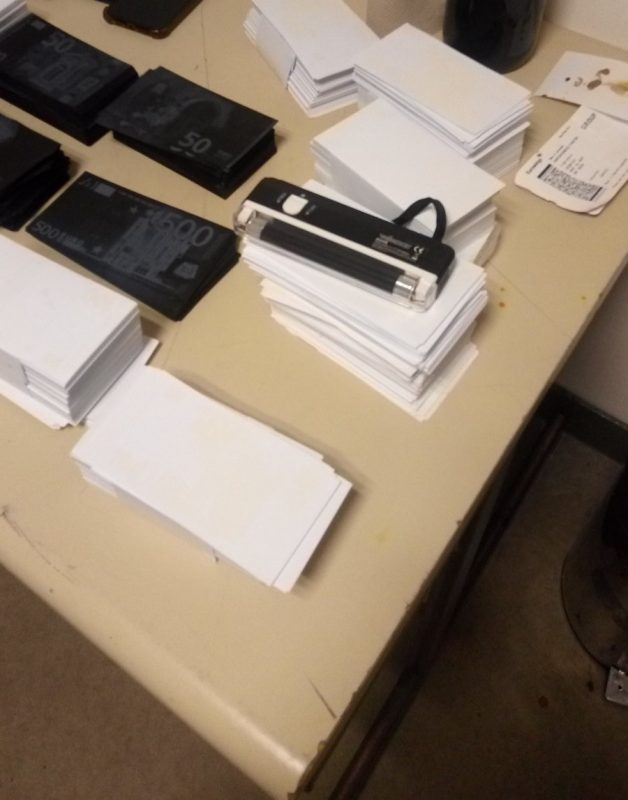 При преглед на багажот кај вториот Камерунец биле пронајдени 2.072 исечени парчиња хартија со црна позадина на кои од двете страни е отпечатен дел од дизајнот на банкноти од 50 евра, 1.321 парчиња со дизајн на банкноти од 100 евра, 247 парчиња од 200 евра, 104 со дизајн на банкноти од 500 евра, како и една француска лична карта и една камерунска патна исправа на име С.И.Ф. за кои нема податоци дека се вистинити.