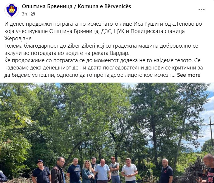 И денеска продолжи потрагата по исчезнатото лице Иса Рушити од село Теново во која учествуваше Општина Брвеница, ДЗС, ЦУК и Полициската станица Жеровјане, соопшти Општината.