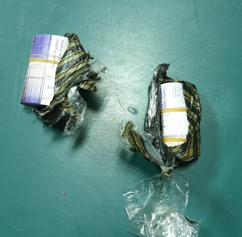 При извршена детаљна контрола и личен претрес на возачот во внатрешниот џеб на панталоните му биле пронајдени непријавени две пакувања обвиени со црн најлон и селотејп, во кои се наоѓале 100.000 швајцарски франци.