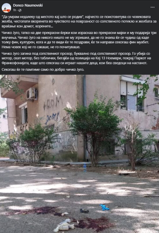 Чичко Југо загина под сопствениот прозор, буквално под сопствениот прозор. Го убија со мотор, скап мотор, без таблички, бегајќи од полиција на Кеј 13 Ноември, покрај Паркот на Франкофонијата, каде што секогаш си играат нашите деца, кои беа сведоци на настанот.