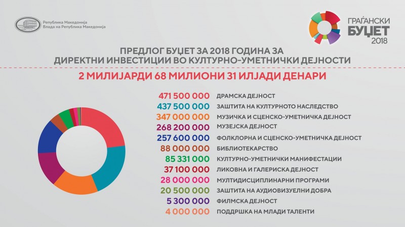 За идната година Владата издвои за културата 4 милјарди 268 милиони и 497 илјади денари, односно 69 милиони и 406 илјади евра. Споредено со лани, тоа е зголемување за 4,48 отсто. Ако се спореди со буџетите на земјите во регионот, процентот од 2 отсто од вкупниот владин буџет што се излева за култура е најголем.