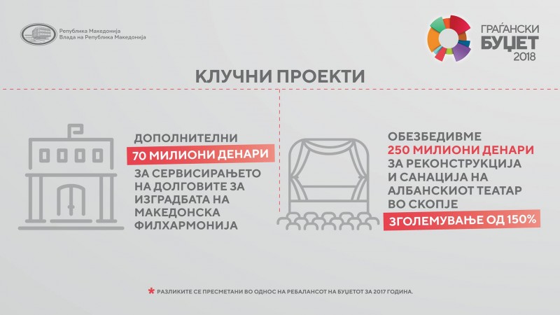 Како наследени обврски за финансирање sе сервисирање на обврските за изградбата на Македонската филхармонија со 600 милиони денари, потоа 13 отсто ќе се потрошат за изградба на Албанскиот театар во Скопје и Театарот и Библиотеката во Тетово, 12 отсто за драмската дејност, 11 отсто заштита на културното наследство, 9 отсто за музичко и сценско-уметничката дејност, 7 отсто за фолклорната и сценско-уметничката дејност, 6,9 отсто за музејската дејност, 6,3 отсто се за блок-дотациите до единиците на локалната самоуправа, а околу 4 отсто или 154.5 милиони денари за Агенцијата за филм.