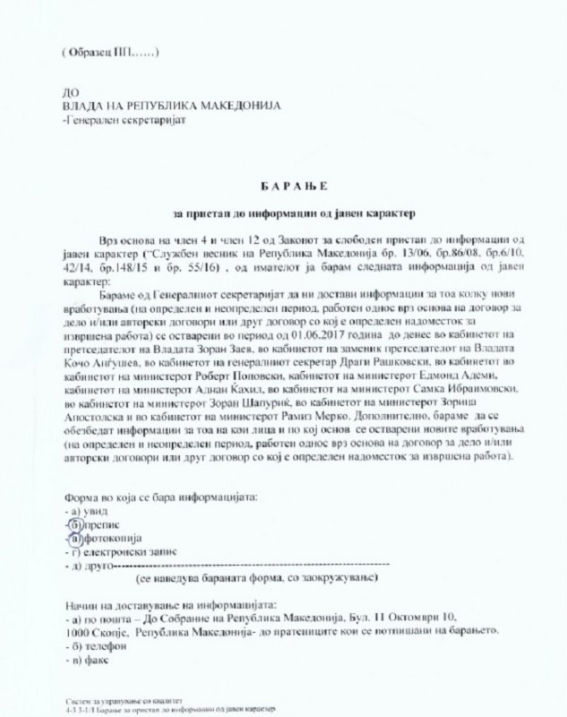 Со овие барања, велат од таму, ја искористуваме нашата законска можност да добиеме одговори за тоа колку нови луѓе се вработени или ангажирани по основа на договор на определено или неопределено време, како и работни односи по основа на договори на дело, авторски договори или други договори.