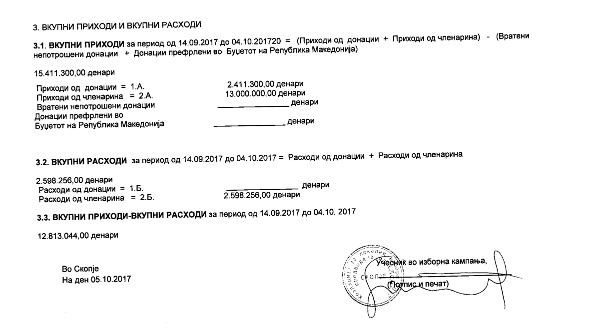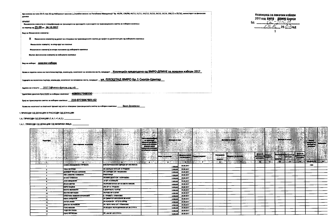 Најскапа изборна кампања за локалните избори има опозициската ВМРО-ДПМНЕ, покажаа финансиските извештаи за првите 10 дена доставени до  Државната изборна комисија. Според поднесените извештаи, ВМРО-ДПМНЕ од 207 донатори собрала вкупно 2.882.792 денари или приближно 47 илјади евра, а од членарина 30.000.000 денари или 488 илјади евра. За партијата донирале кандидатот за градоначалник на општина Гевгелија, Иван Франгов, кој донирал 1000 евра, како и градоначалникот на општина Аеродром, Ивица Коневски, кој за партијата издвоил 500 евра. Коце Трајановски, кандидатот за нов мандат на град Скопје на 20 септември уплатил 1000 евра. Од останатите кандидати за градоначалници на ВМРО-ДПМНЕ, 1000 евра дал кандидатот за нов мандат како градоначалник на општина Гази Баба, Тони Трајковски, како и Јохан Тарчуловски. Жарко Караџоски, ексдиректорот на ЈП Македонски шуми бил поскромен, па одвоил само 5000 денари.
