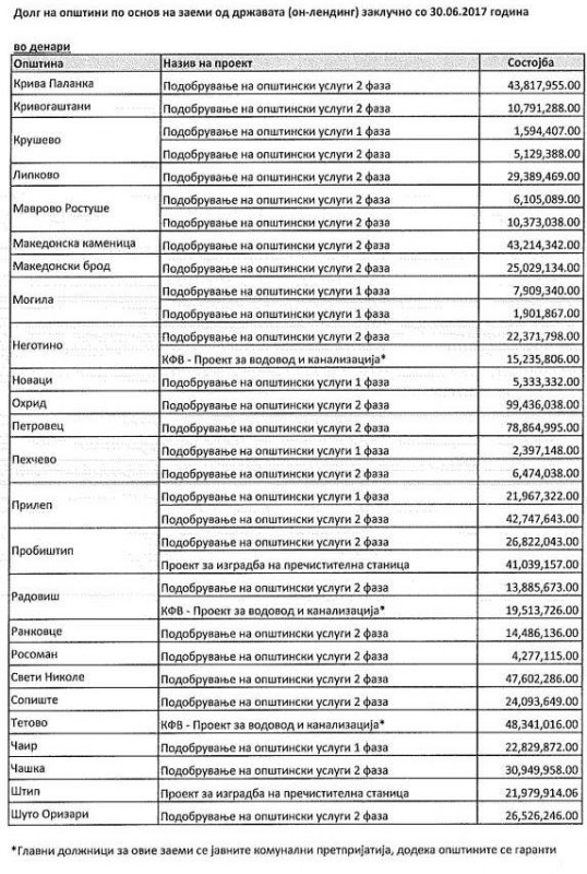 На барање на „Макфакс“ за пристап до информации од јавен карактер Министерството за финансии испрати список на сите општини кои имаат задолжување кај домашни и странски деловни банки, како и состојба на долг на јавните претпријатија по основа на задолжување кај државата (он-лендинг), заклучно со 30.06.2017 година.