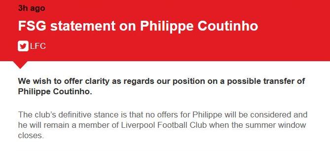 „Дефинитивен став на клубот е дека нема да разгледува никакви понуди за Кутињо и дека тој ќе остане член на Ливерпул и кога ќе заврши преодниот рок“, се наведува во краткото соопштение на сопствениците „Фенвеј спортс груп“.