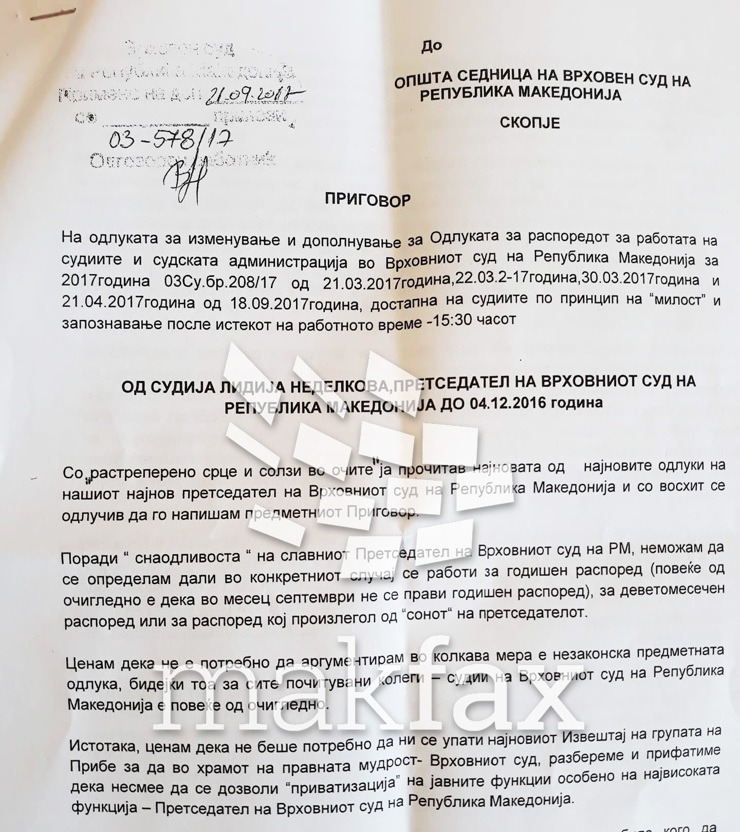 Судијката Лидија Неделкова, која по доаѓањето на Јово Вангеловски за претседател на судот, неколкупати е прераспоредувана да суди во различни оддели во Врховниот суд, поднела саркастичен приговор за нејзината последна распределба во нов оддел, покажува документот до кој дојде „Макфакс“. Неделкова тврди дека одлуките за нејзино прераспоредување се незаконски и спротивни на судскиот деловник и Законот за судови. „Со растреперено срце и солзи во очите ја прочитав најновата одлука на нашиот најнов претседател на Врховниот суд на Република Македонија и со восхит одлучив да го напишам предметниот приговор“, пишува Неделкова во приговорот.