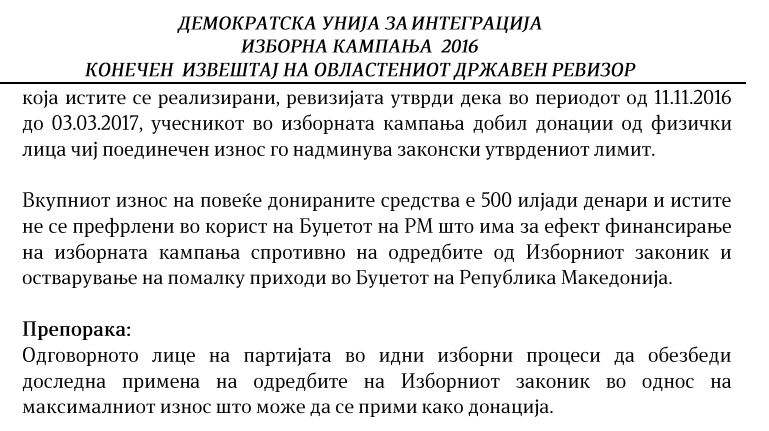 Во ревизијата за приходите и расходите на Демократската унија за интеграција за изборите во 2016 година се нагласува неповолно мислење за вистинитоста и објективноста на финансискиот извештај. Според пресметките на ревизорите, во периодот од 11 ноември 2016 година до 3 март 2017 година партијата на Али Ахмети добила донации од физички лица чиј поединечен износ го надминува законскиот лимит. Станува збор за сума од пола милион денари. „Парите не се префрлени во корист на буџетот на РМ што има за ефект финансирање на изборната кампања спротивно на одредбите од Изборниот законик и остварување помалку приходи во буџетот на Република Македонија“, напишале ревизорите за финансискиот извештај на ДУИ.