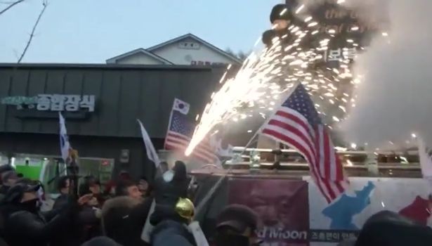 Демонстрантите мавтаа со знамињата на Јужна Кореја и САД. Немирите избија во непосредна близина на местото каде што се одржа церемонијата на отворањето на Олимписките игри.